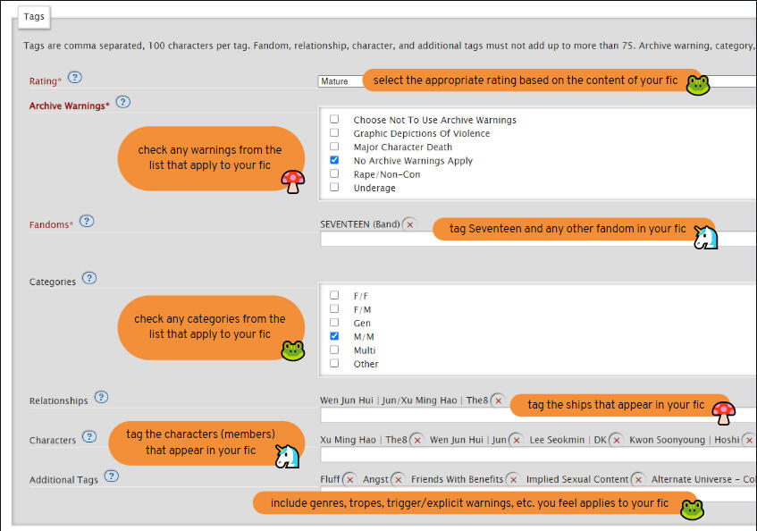 Refer to the Fic Festing 101 - content warnings page for a list of triggering subjects it's recommended you tag for.If you have any questions, feel free to reach out to the mods.